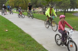 Youngsters lead their parents on the Beginner Ride that started with a ride through the park before moving to a dirt trail.