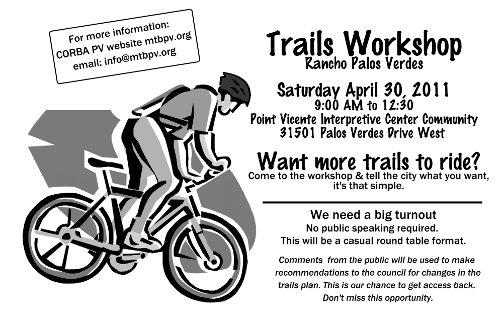 The City of Rancho Palos Verdes will be collecting public input at this workshop to prepare recommendations for amendments to the Palos Verdes Nature Preserve Trails Plan. This will include trail use changes and the Filiorum Reserve. The City Council will then consider the recommendations later this summer.