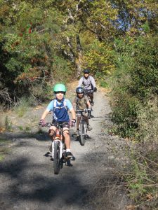 The group rode the gradual incline for about 2 miles, some choosing to walk rather than ride over the concrete waffle blocks that dot the area. A downed tree blocked the rest of the trail at about 2 and 1/2 miles in, so the group took that as a sign to take a break, have a snack and explore the area. Kat found a small bit of California Sage, and introduced the boys to what some hikers call “Cowboy Cologne.” The boys pretended to be characters from Star Wars, and then Kat pointed out the large leaves on the trail, which were bigger than most of their faces.
