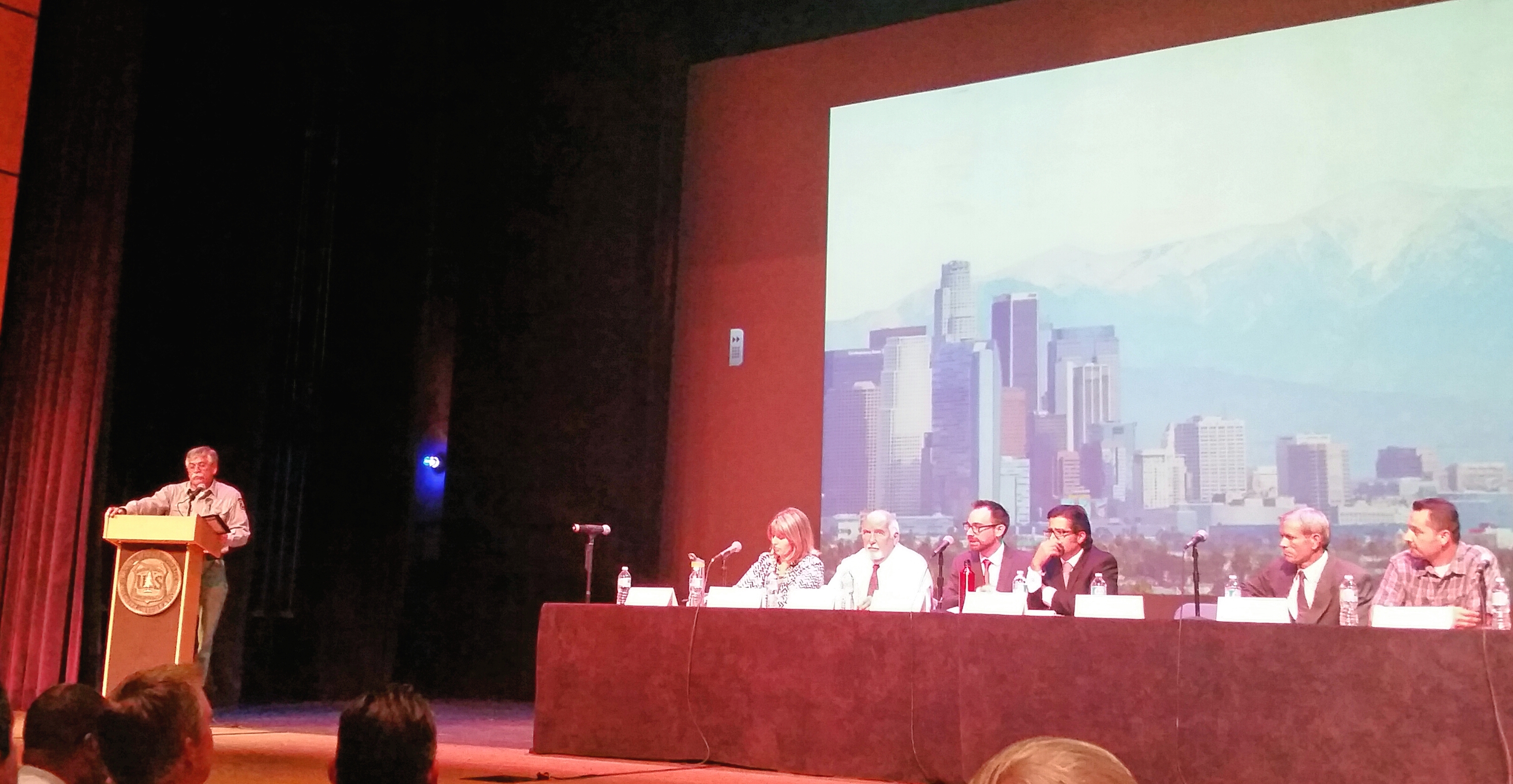 Supervisor Tom Contreras intLast night an overflowing crowd packed into the Baldwin Park Performing Arts Center to hear from a panel of “experts” about the future of the San Gabriel Mountains. Among the honored guests and panel of experts were Robert Bonnie, the undersecretary for the Department of Agriculture, Tom Tidwell, Chief Forester of the Forest Service, Randy Moore, Regional Forester for the Southwest United States, and congressmen Judy Chu, Los Angeles County Supervisor-elect Hilda Solis, Janice Rutherford, San Bernardino Board of Supervisors Chairperson. Local politicians and wilderness advocates rounded out the panel, with Victor Diaz, chair of the Friends of the Angeles group, as the sole “user group” representative.