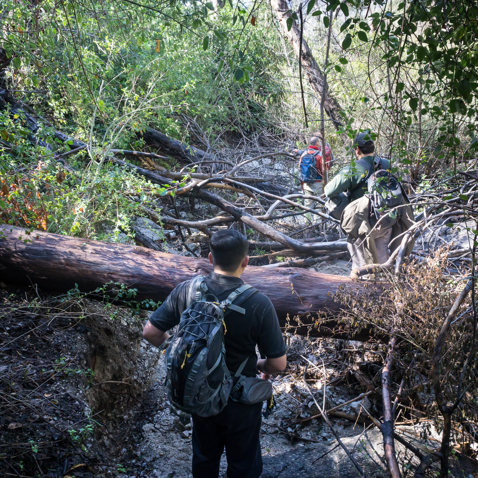 In early 2016 we did a hike-through inspection of the trail with Forest Service staff, Bellfree Contractors, Los Angeles Conservation Corps and Boy Scout volunteers. The arduous journey involved climbing over and under dozens and dozens of downed trees, searching for remnants of trail where it had been washed away, and dodging and ducking heavy brush. Sections of the trail were completely gone, the only route was to hike along the streambed, which was also covered in downed trees.