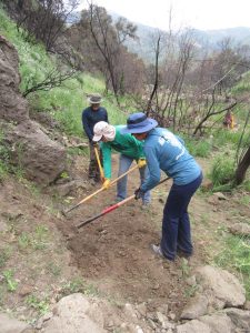 Overall the trail was in pretty good shape after the Woolsey Fire burned all the hillside brush in November and then winter rains flooded everything, but there were a few very serious problems that we needed to address. The worst was a 3-foot culvert that was uprooted and deposited in the middle of the trail, blocking it, and leaving a deep rut where it had been. Also, a large oak tree was uprooted and fell across the trail.