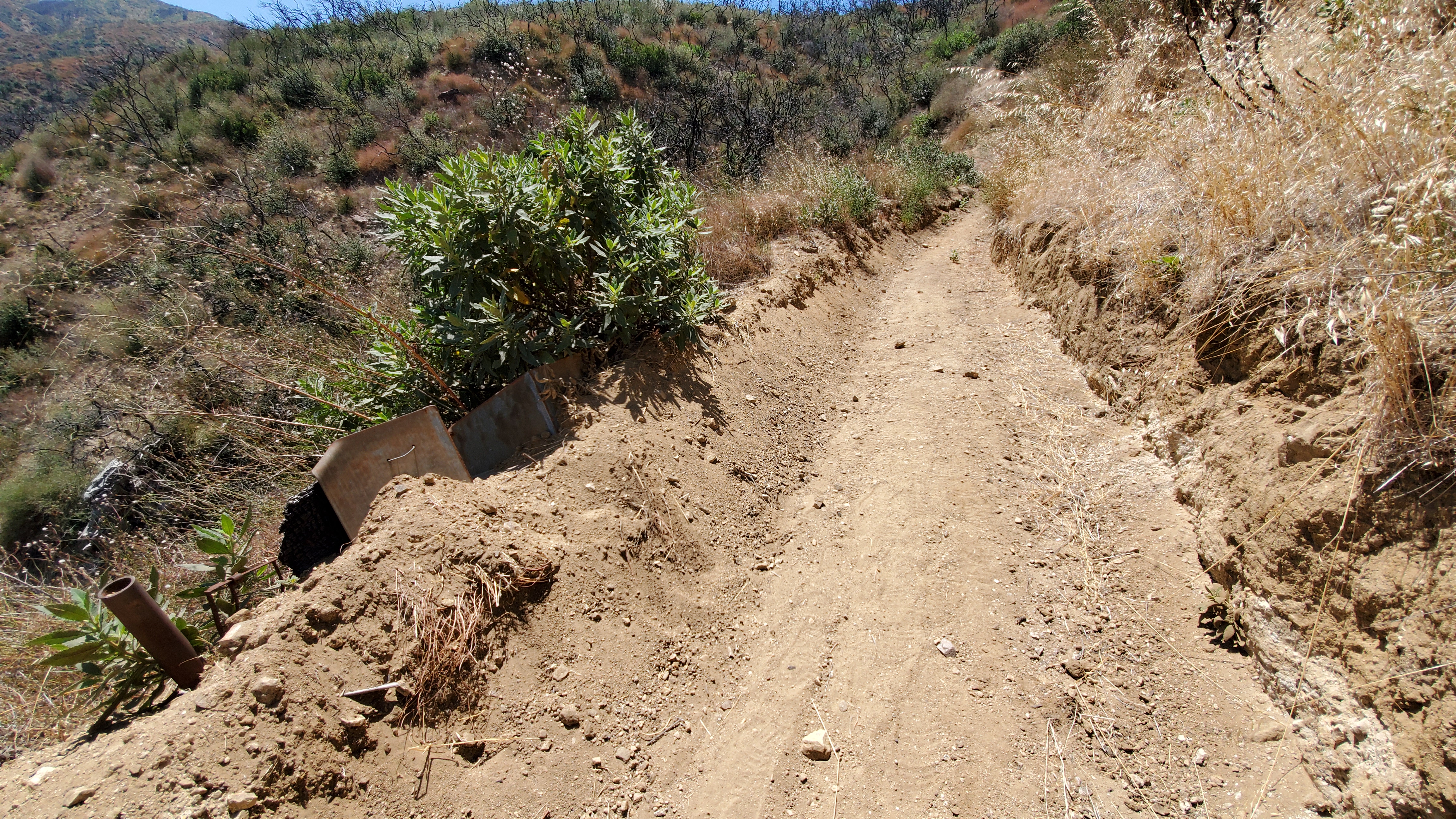The machine-work done on the trail by LA County’s mechanized trail crew left no drainage and a water-trapping berm that would ensure the trail becomes eroded and rutted with the next rains. In fact, they bladed over existing drainage such as the failed the culvert pictured above. About 20 Volunteers constructed more than 20 drains on the first mile of the trail from the bottom. Meanwhile, a second crew were shuttled to the top of the trail by LA County staff, and cut back overgrown brush on the upper mile or so of trail.