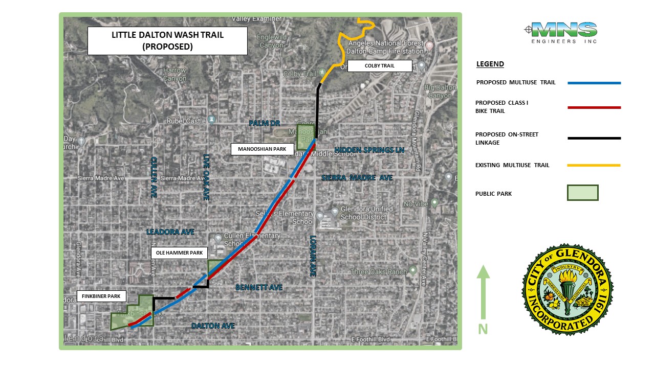 The City of Glendora invites you to a public workshop held in conjunction with a proposed grant application to the California Natural Resources Agency under Proposition 68. The City is proposing to submit an application for the Little Dalton Wash. The project would construct a bike/pedestrian path similar to the existing Glendora Urban Trail and extend from Finkbiner Park to just south of the spreading grounds near Glendora Mountain Road. The City will be holding a workshop to solicit input and feedback on this exciting opportunity to create and enhance open space, trail connectivity, and recreational opportunities for Glendora, on Monday, Sep 30th.
