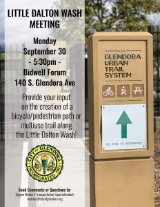 The City of Glendora invites you to a public workshop held in conjunction with a proposed grant application to the California Natural Resources Agency under Proposition 68. The City is proposing to submit an application for the Little Dalton Wash. The project would construct a bike/pedestrian path similar to the existing Glendora Urban Trail and extend from Finkbiner Park to just south of the spreading grounds near Glendora Mountain Road. The City will be holding a workshop to solicit input and feedback on this exciting opportunity to create and enhance open space, trail connectivity, and recreational opportunities for Glendora, on Monday, Sep 30th.