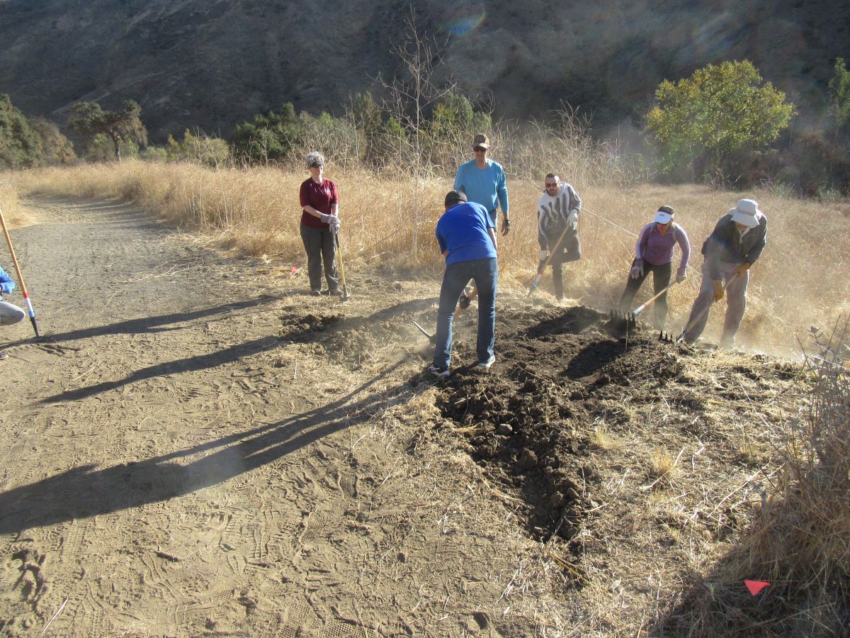 About 80 open space enthusiasts came out to help fix up the trails in the Conejo Canyons in preparation for winter rains. Volunteers came from various organizations such as the Santa Monica Mountains Trails Council (SMMTC), CORBA, the El Camino Real charter high school mountain bike team, various Meetup groups and others. The CORBA crew added drains to natural dips in the Hill Canyon Trail so they wouldn’t become muddy bogs when it rains. The other folks hiked up the Canyon Overlook Trail to fill in ruts and remove loose rocks. At noon, the volunteers were rewarded with a taco lunch and prize give-away to thank them for their hard work and generosity in donating their time to open space improvement. COSF, COSCA and the other organizations would like to give a hearty thank-you to all the volunteers!